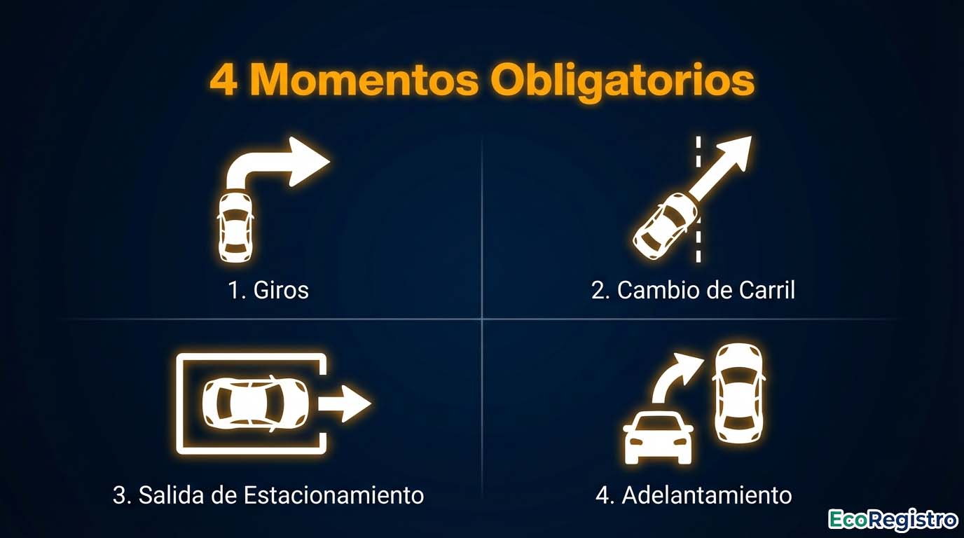 - Al realizar cualquier giro o cambio de dirección: Para girar a la derecha o a la izquierda en una intersección, es obligatorio ubicarse en el carril correspondiente y poner la señal de giro del lado hacia el cual se va a doblar.