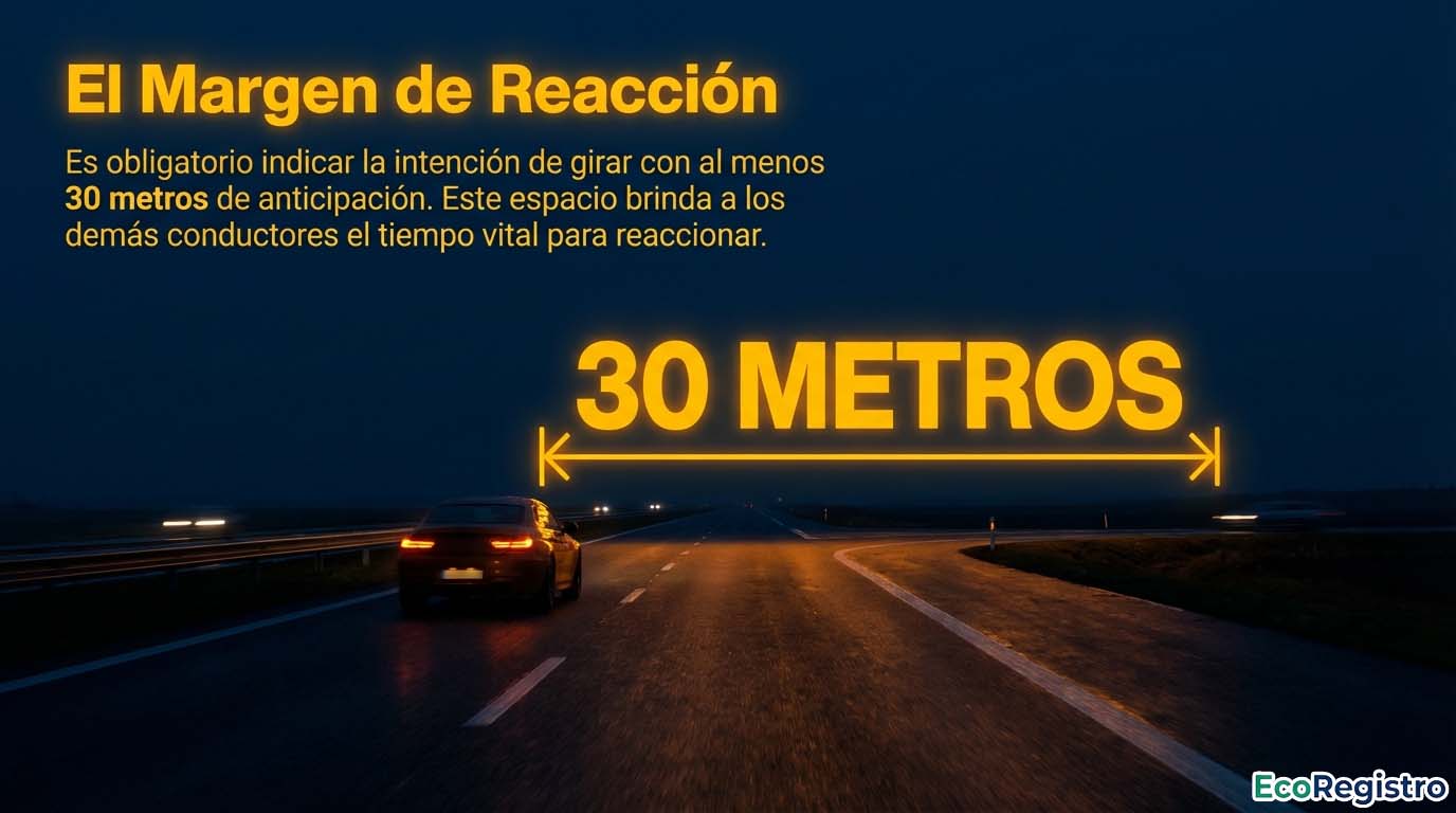 Es obligatorio indicar la intención de girar con por lo menos 30 metros de anticipación. Esto brinda un margen de seguridad vital para que los demás vehículos tengan tiempo de reaccionar y no se produzca un choque.
