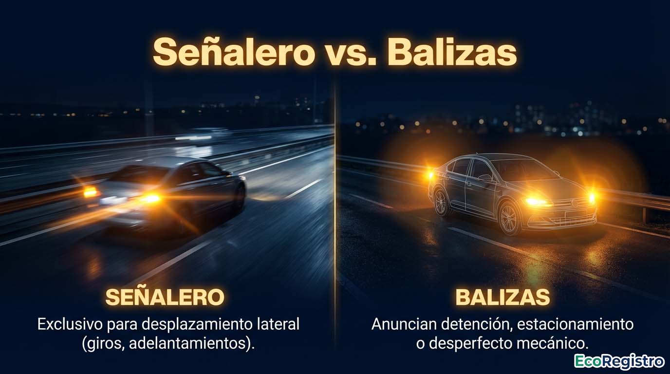 El señalero único se utiliza exclusivamente para maniobras de desplazamiento lateral: giros, cambios de carril, adelantamientos o salidas de estacionamientos. En cambio, las balizas se deben encender de forma anticipada para anunciar que el vehículo se va a detener o que tiene la intención de estacionar en el lugar. También se usan ante un desperfecto mecánico para advertir a otros conductores de la inmovilización del vehículo.