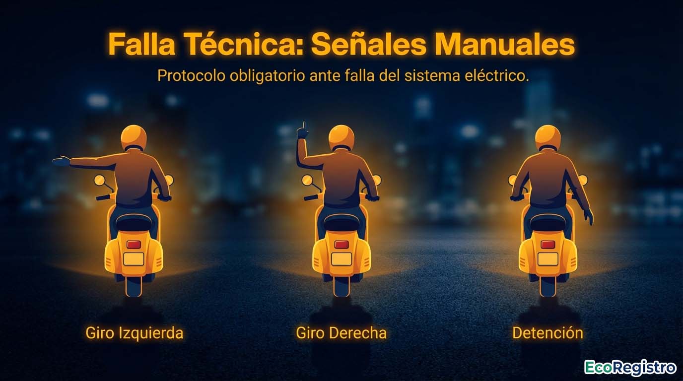 Si el sistema luminoso falla, la normativa establece que se deben realizar señales manuales sacando el brazo por fuera del vehículo de la siguiente manera: